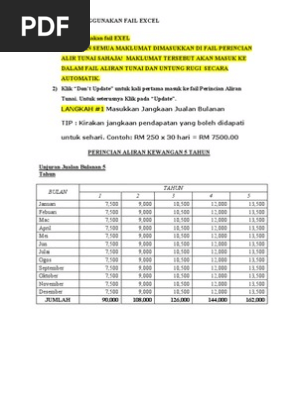 Pendapatan, atau pendapatan, boleh dari operasi atau dari sumber yang tidak berkaitan secara langsung dengan aktiviti utama perniagaan. Ini membantu menganalisis bagaimana perniagaan membuat penjualan, semua. Pengiraan rancangan kewangan perniagaan seperti penyata untung rugi & penyata aliran tunai untuk 3 tahun atau 5 tahun memang susah dan pening untuk dikira, tetapi benda inilah yang akan diteliti oleh pihak bank�� tapi kini�. 100%(2)100% found this document useful (2 votes). Dalam pelan perniagaan, kami akan perlu untuk menjana penyata kewangan yang melihat ke masa depan dan berlangsung dalam beberapa tahun.