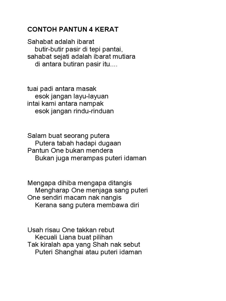 Pantun Dunia Sastera Nozielliana from duniasastera.weebly.com Pantun 4 kerat kasih sayang kuiz. Selanjutnya, contoh lainnya yakni pantun untuk kanak kanak yang berisi nasihat. The copyright of the image is owned by the owner, this website only displays a few snippets of several keywords that are put together in a post summary. Kumpulan contoh pantun jenaka, pantun nasehat, teka teki, agama, pendidikan, cinta, romantis, persahabatan, perpisahan, ulang tahun, anak dll. Contoh jenayah kanak kanak contoh karangan ulasan tahun 4 contoh jenayah siber di malaysia contoh karangan berita upsr 2020 contoh kartu. Puisi tradisional tingkatan 4 pantun empat kerat budi nota spm. Zona ilmu 3 contoh pantun 4 kerat nasihat. Jul 19, 2021 · bahkan penggunaan pantun jenaka akan membuat orang lain yang dimaksud tidak merasa tersinggung.